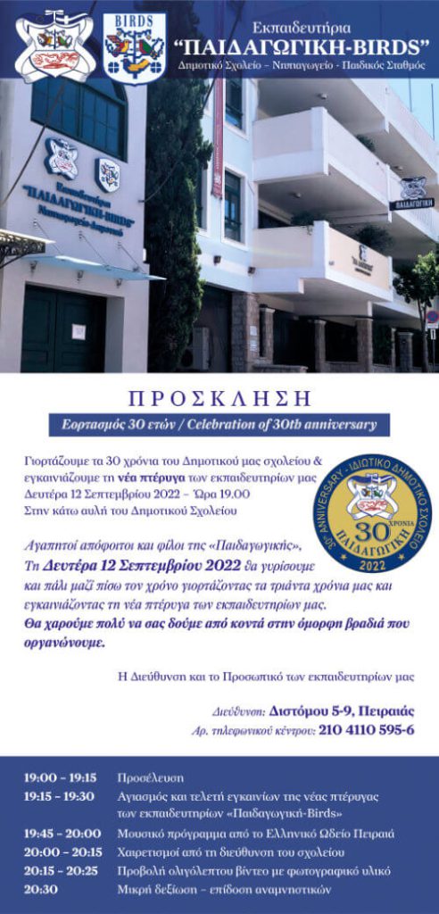 Με ιδιαίτερη χαρά σας καλούμε το απόγευμα της Δευτέρας 12 Σεπτεμβρίου 2022 στα εγκαίνια της νέας πτέρυγας των εκπαιδευτηρίων μας και στον εορτασμό των τριάντα ετών λειτουργίας του Δημοτικού Σχολείου μας, “ΠΑΙΔΑΓΩΓΙΚΗ”.