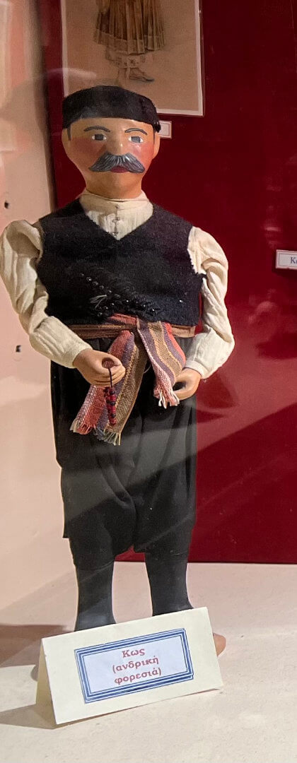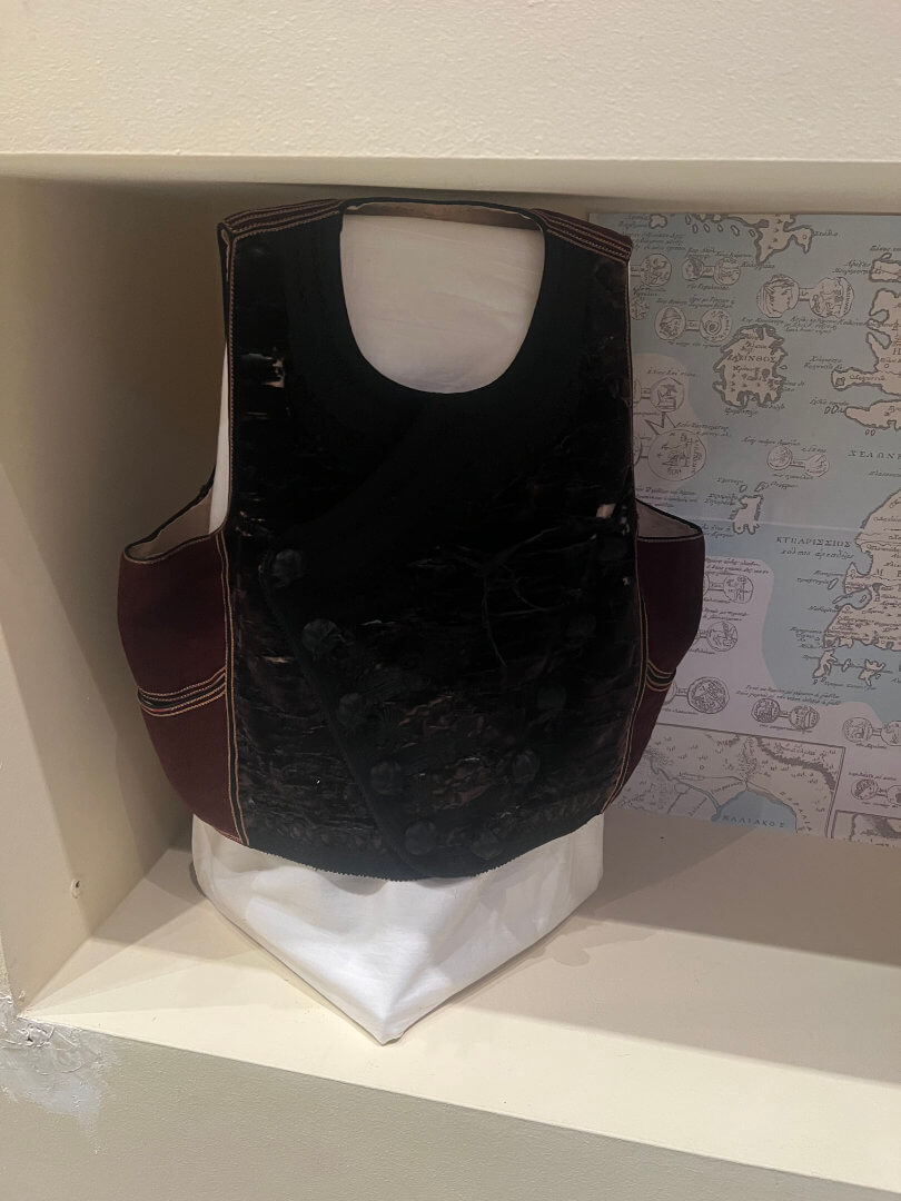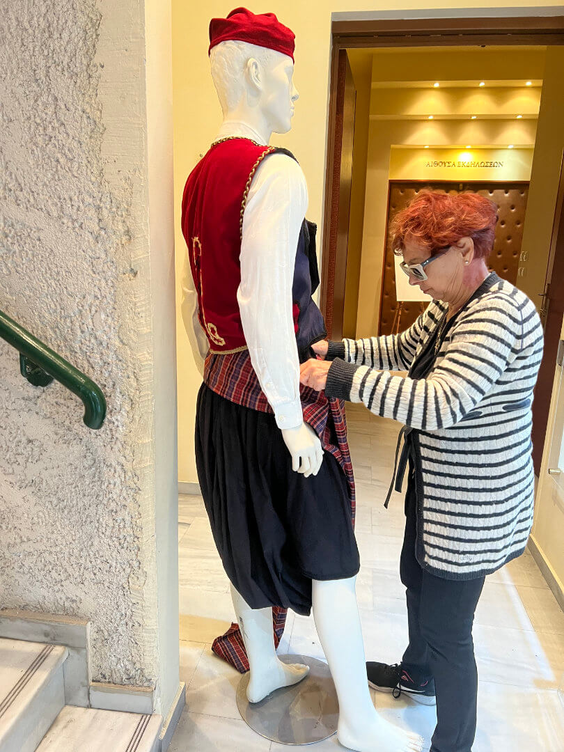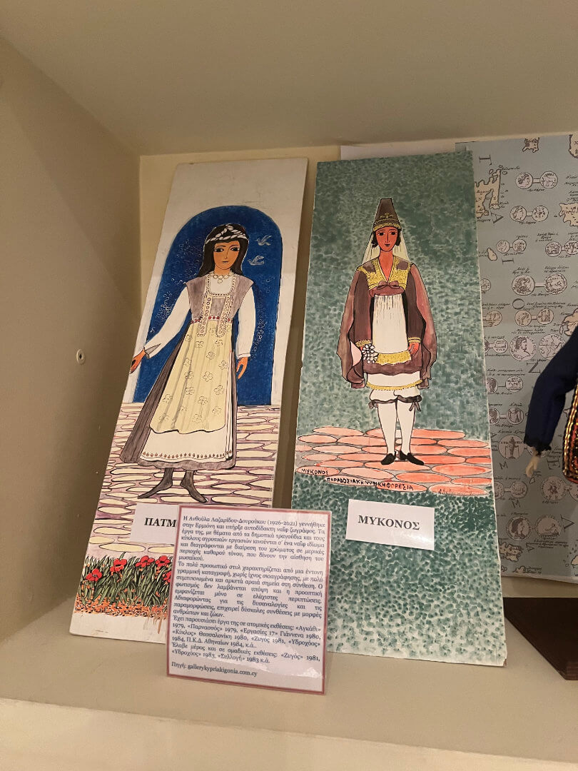Επίσης αξίζει να γίνει ιδιαίτερη μνεία στο εικαστικό έργο με ναΐβ χαρακτηριστικά της γνωστής λαϊκής ζωγράφου Ανθούλας Λαζαρίδου-Δουρούκου (1926-2021) με λαϊκές παραδοσιακές φορεσιές ένα δείγμα του οποίου κοσμεί την έκθεσή μας. Επίσης στην έκθεσή μας υπάρχουν κι άλλα ενδιαφέροντα δείγματα όπως ένα αυθεντικό ανδρικό παραδοσιακό γιλέκο του 1802, ένα αναπαλαιωμένο μαντήλι γυναικείας φορεσιάς της Ερμιόνης, μία ανδρική κούκλα – νησιώτης βρακοφόρος σε φυσική διάσταση, κ.ά. Τις προθήκες πλαισιώνουν παλαιοί χάρτες – των αντίστοιχων με τις παραδοσιακές στολές που παρουσιάζονται – περιοχών.