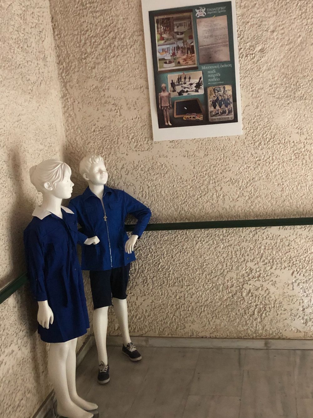 Δ) Σχολικά αντικείμενα και ρούχα (πλάκες γραφής, κοντυλοφόροι, κουδούνι, κασετίνα, πηλίκιο, ποδιές)