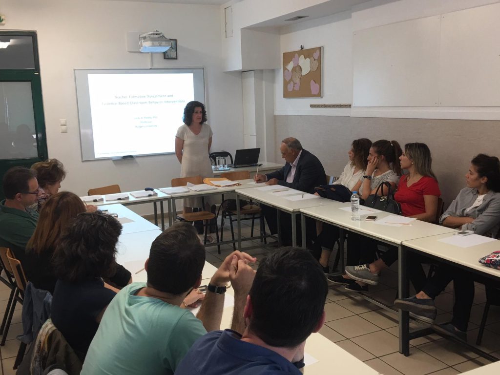 Η διάσημη Αμερικανίδα καθηγήτρια εκπαιδευτικής ψυχολογίας του Rutgers University, Linda Reddy επισκέφθηκε το σχολείο μας και συνεργάστηκε με όλους τους εκπαιδευτικούς συζητώντας θέματα διαχείρισης τάξης, coaching εκπαιδευτικών και αξιολόγησης εκπαιδευτικού έργου. Ήταν μία ιδιαίτερα εποικοδομητική και ωφέλιμη συνάντηση η οποία πραγματοποιήθηκε μέσα σε ένα ζεστό, συναδελφικό κλίμα ανταλλαγής επιστημονικών απόψεων και εκπαιδευτικών εμπειριών.  Η επίσκεψη της καθηγήτριας ολοκληρώθηκε με μία ωραία βόλτα στο γραφικό Μικρολίμανο και ξενάγηση στις εγκαταστάσεις του ιστορικού Ναυτικού Ομίλου Πειραιά. Ευχαριστούμε από καρδιάς την