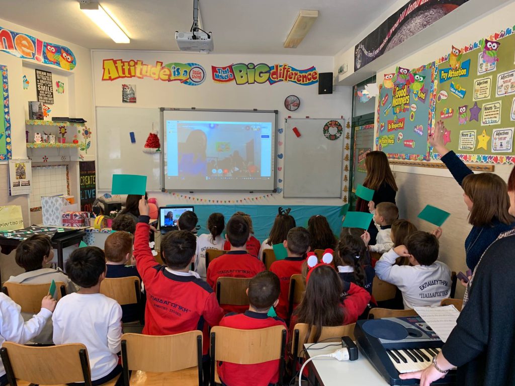 Στο πλαίσιο του μαθήματος των Αγγλικών, μαθητές της Β΄ τάξης του σχολείου μας είχαν την ευκαιρία να έρθουν σε επαφή μέσω τηλεδιάσκεψης με μαθητές αντίστοιχης ηλικίας από το Maria Breed Montessori International School της Νιγηρίας, σχολείο διεθνώς πιστοποιημένο από το Βρετανικό Συμβούλιο. Πιο συγκεκριμένα, οι μαθητές μας αντάλλαξαν ευχετήριες κάρτες, έψαλλαν τα κάλαντα στα ελληνικά και τα αγγλικά και άκουσαν τα κάλαντα σε παραδοσιακές διαλέκτους της Νιγηρίας συνοδεία παραδοσιακών στολών.