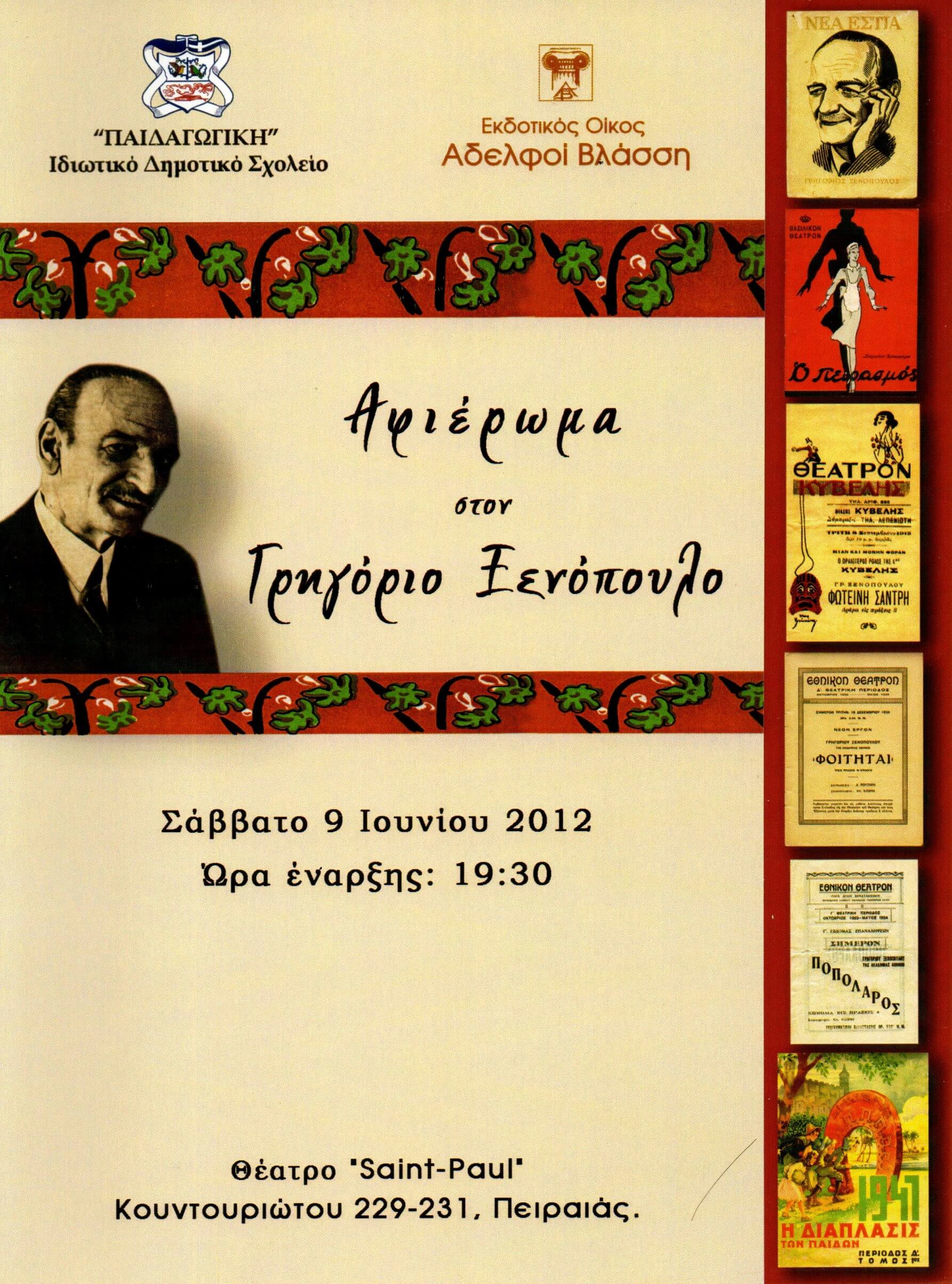 Η Έκθεση-Αφιέρωμα στον Γρηγόριο Ξενόπουλο η οποία οργανώθηκε σε συνεργασία με τις εκδόσεις αδελφοί Βλάσση έγινε με αφορμή τη συμπλήρωση 60 ετών από το θάνατο του μεγάλου Έλληνα λογοτέχνη το σχολικό έτος 2011-2012. Στο μουσειακό χώρο του σχολείου εκτέθηκαν πολύ σπάνιες εκδόσεις έργων του Γρηγόριου Ξενόπουλου, τεύχη από τη «θρυλική» Διάπλαση των Παίδων, σπάνιο φωτογραφικό υλικό από τη ζωή του συγγραφέα, υλικό τις παραστάσεις των θεατρικών του έργων, αντίγραφα από χειρόγραφα του συγγραφέα, φωτογραφίες από παραστάσεις και παλαιά σήριαλς της κρατικής τηλεόρασης («Ο κόσμος και ο Κοσμάς», 1981 με πρωταγωνιστές τον Κ. Ρηγόπουλο και Γ. Αντζολετάκη και «Οι μυστικοί αρραβώνες»). Επίσης οι μαθητές του Θεατρικού Εργαστηρίου του σχολείου υπό τη διεύθυνση του σκηνοθέτη Μάνου Βενιέρη παρουσίασαν τα δραματοποιημένα διηγήματα του Ζακυνθινού λογοτέχνη: «Μια Γαλλίδα», «Το συμβούλιο των Δαχτύλων», «Η κούκλα της Νύφης», «Τι είναι ζωή», «Πουλιά και έντομα», «Το ψωμί», «Η κυρία Τρομάρα», «Στο Ποντικόσπιτο» και «Έντεκα Χρονών».